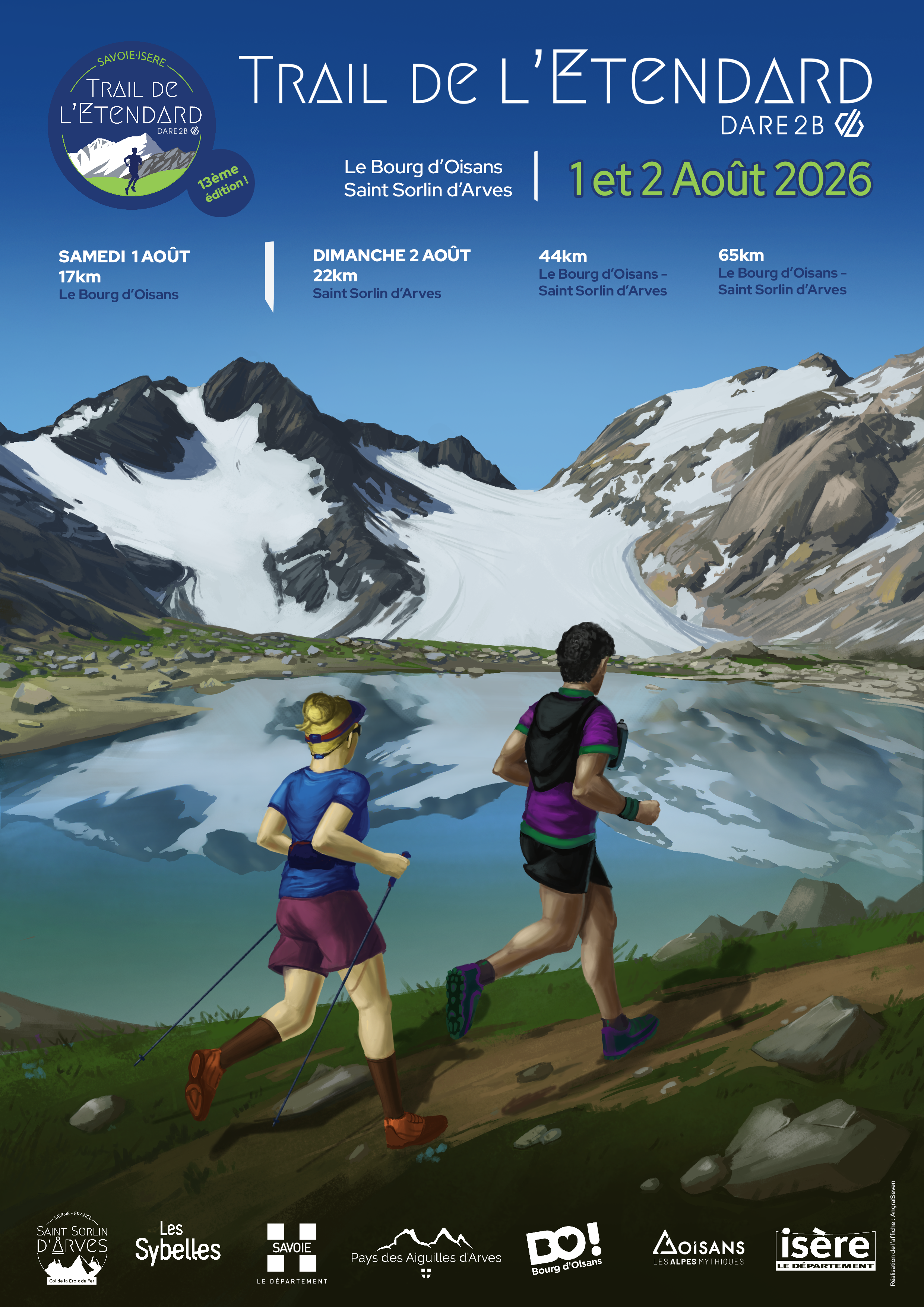 • Le Trail 65 km le dimanche 2 août (65 km avec 3624 m de dénivelé positif) qui traversera le massif des Grandes Rousses au départ de Bourg d’Oisans, en passant au pied du Glacier de l’Étendard avec un passage à proximité de 12 lacs remarquables, comme le lac Blanc, le lac Bramant ou encore le lac de Grand Maison et une boucle passant au pied du Pic de l’Etendard, final majestueux, avant de rejoindre le bas du village de Saint Sorlin d’Arves.